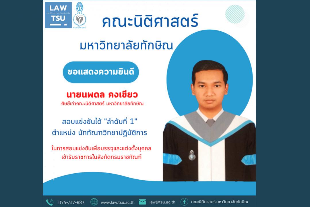 คณะนิติศาสตร์ มหาวิทยาลัยทักษิณ ขอแสดงความยินดีกับ นายนพดล คงเขียว ศิษย์เก่าคณะนิติศาสตร์ มหาวิทยาลัยทักษิณ สอบแข่งขันได้ลำดับที่ 1 ตำแหน่งนักทัณฑวิทยาปฏิบัติการ ในการสอบแข่งขันเพื่อบรรจุและแต่งตั้งบุคคลเข้ารับราชการในสังกัดกรมราชทัณฑ์