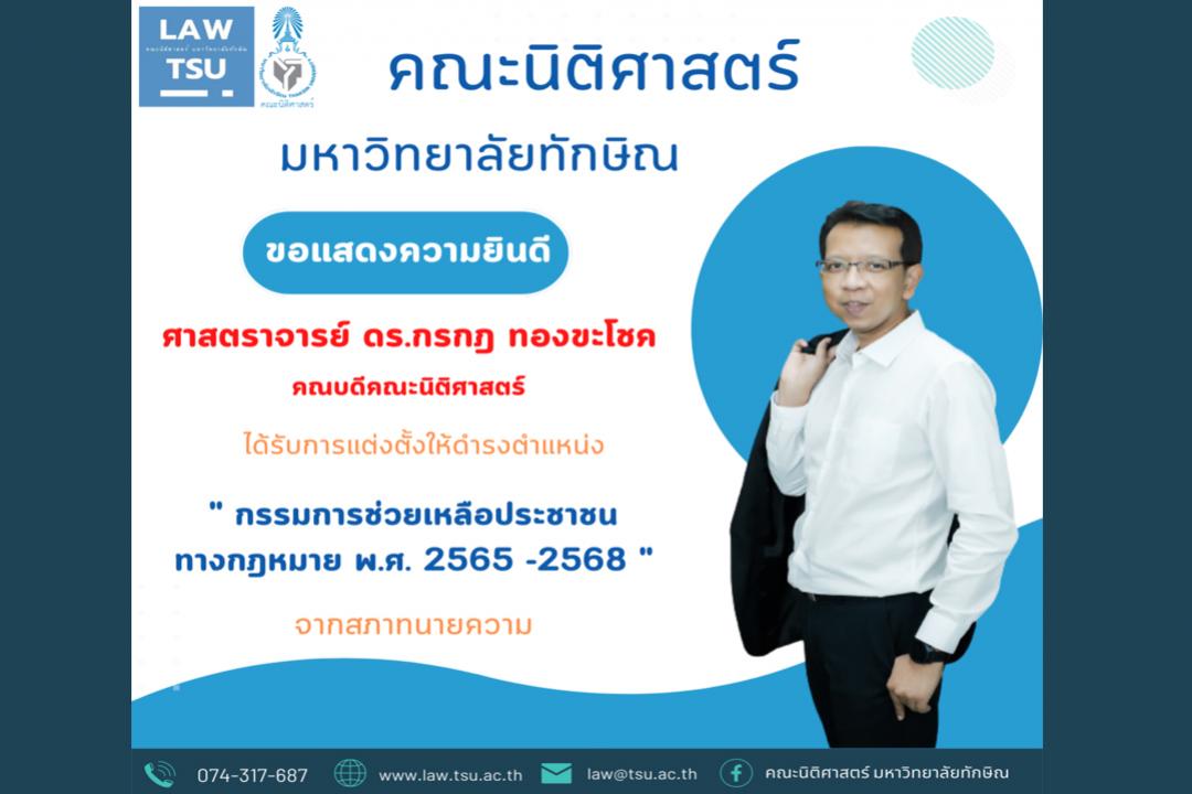 คณะนิติศาสตร์ มหาวิทยาลัยทักษิณ ขอแสดงความยินดีกับ ศาสตราจารย์ ดร.กรกฎ ทองขะโชค คณบดีคณะนิติศาสตร์ มหาวิทยาลัยทักษิณ ในโอกาสได้รับการแต่งตั้งจากสภาทนายความเป็นกรรมการช่วยเหลือประชาชนทางกฎหมาย พ.ศ. 2565-2568