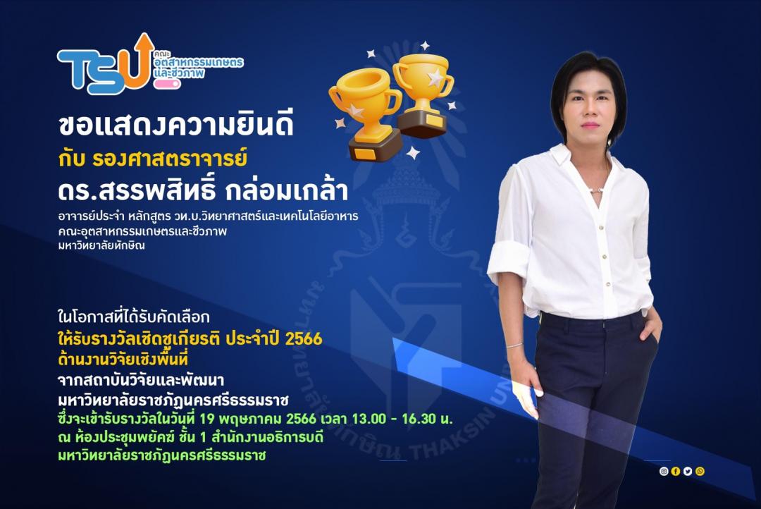 รศ.ดร.สรรพสิทธิ์ กล่อมเกล้า ได้รับรางวัลเชิดชูเกียรติ ด้านงานวิจัยเชิงพื้นที่ ประจำปี 2566 จากมหาวิทยาลัยราชภัฏนครศรีธรรมราช