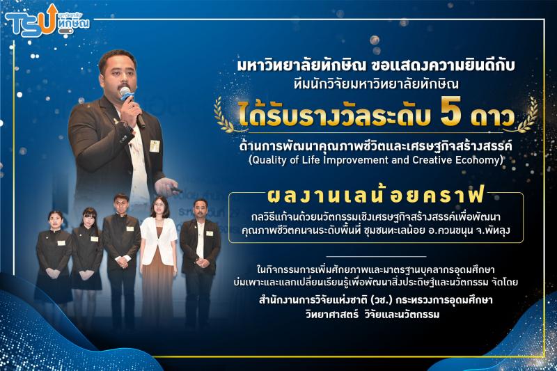 ผลงานเลน้อยคราฟ : กลวิธีแก้จนด้วยนวัตกรรมเชิงเศรษฐกิจสร้างสรรค์ เพื่อพัฒนาคุณภาพชีวิตคนจนระดับพื้นที่ ชุมชนทะเลน้อย อำเภอควนขนุน จังหวัดพัทลุง ได้รับรางวัลระดับ 5 ดาว มหาวิทยาลัยทักษิณ ขอแสดงความยินดีกับรางวัลระดับ 5 ดาว ด้านการพัฒนาคุณภาพชีวิตและเศรษฐกิจสร้างสรรค์ (Quality of Life Improvement and Creative Economy) ผลงานชื่อ เลน้อยคราฟ : กลวิธีแก้จนด้วยนวัตกรรมเชิงเศรษฐกิจสร้างสรรค์ เพื่อพัฒนาคุณภาพชีวิตคนจนระดับพื้นที่ ชุมชนทะเลน้อย อำเภอควนขนุน จังหวัดพัทลุง ได้รางวัลระดับ 5 ดาว ได้รับเงินรางวัลละ 5,000 บาท พร้อมเกียรติบัตร จาก ดร.วิภารัตน์ ดีอ่อง ผู้อำนวยการสำนักงานการวิจัยแห่งชาติ  ในกิจกรรมการเพิ่มศักยภาพและมาตรฐานบุคลากรอุดมศึกษา : บ่มเพาะและแลกเปลี่ยน รียนรู้เพื่อพัฒนาสิ่งประดิษฐ์และนวัตกรรม ระหว่างวันที่ 29 - 31 มกราคม 2567 ณ ห้องแกรนด์บอลรูม โรงแรมมารวย การ์เด้น กรุงเทพฯ จัดโดยสำนักงานการวิจัยแห่งชาติ (วช.) กระทรวงการอุดมศึกษา วิทยาศาสตร์  วิจัยและนวัตกรรม