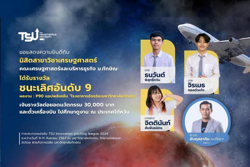 ขอแสดงความยินดีกับนิสิตสาขาวิชาเศรษฐศาสตร์ คณะเศรษฐศาสตร์และบริหารธุรกิจ มหาวิทยาลัยทักษิณ ได้รับรางวัลชนะเลิศอันดับ 9 ผลงาน : P90 แอปพลิเคชัน "โรงอาหารอัจฉริยะมหาวิทยาลัยทักษิณ" นายจิรเมธ ทองดำแก้ว นางสาวจิตตินันท์ สัมพันธมิตร นายธนวันต์ พิสุทธิ์กวิน อาจารย์ที่ปรึกษา : อ.ดร.อับดุลฮากิม มะดีเยาะ ได้รับเงินรางวัลต่อยอดนวัตกรรม สูงสุดถึง 30,000 บาท และตั๋วเครื่องบิน ไปศึกษาดูงาน ณ ประเทศไต้หวัน จัดโดย ฝ่ายกิจการนิสิต มหาวิทยาลัยทักษิณ