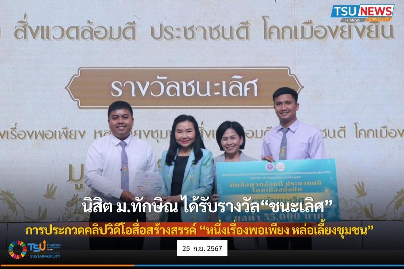 นิสิตสาขาการบริหารและพัฒนาชุมชน คณะมนุษยศาสตร์และสังคมศาสตร์ มหาวิทยาลัยทักษิณ คว้ารางวัลชนะเลิศ อันดับ 1 ระดับประเทศ การประกวดคลิปวิดีโอสื่อสร้างสรรค์ เล่าเรื่องสะท้อนความพอเพียงที่ยั่งยืนของชุมชน “หนึ่งเรื่องพอเพียง หล่อเลี้ยงชุมชน”