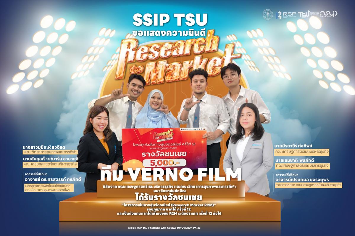 ขอแสดงความยินดีกับ ทีม Verno film  ได้รับการคัดเลือกเป็นตัวแทนของภาคใต้ ไปแข่งขันต่อในระดับประเทศ  ภายใต้โครงการ เส้นทางสู่นวัตวณิชย์ (Research to Market : R2M)  ระดับภูมิภาค ภาคใต้ ประจำปี 2567 ครั้งที่ 12