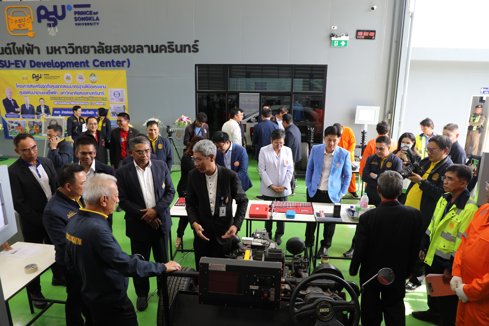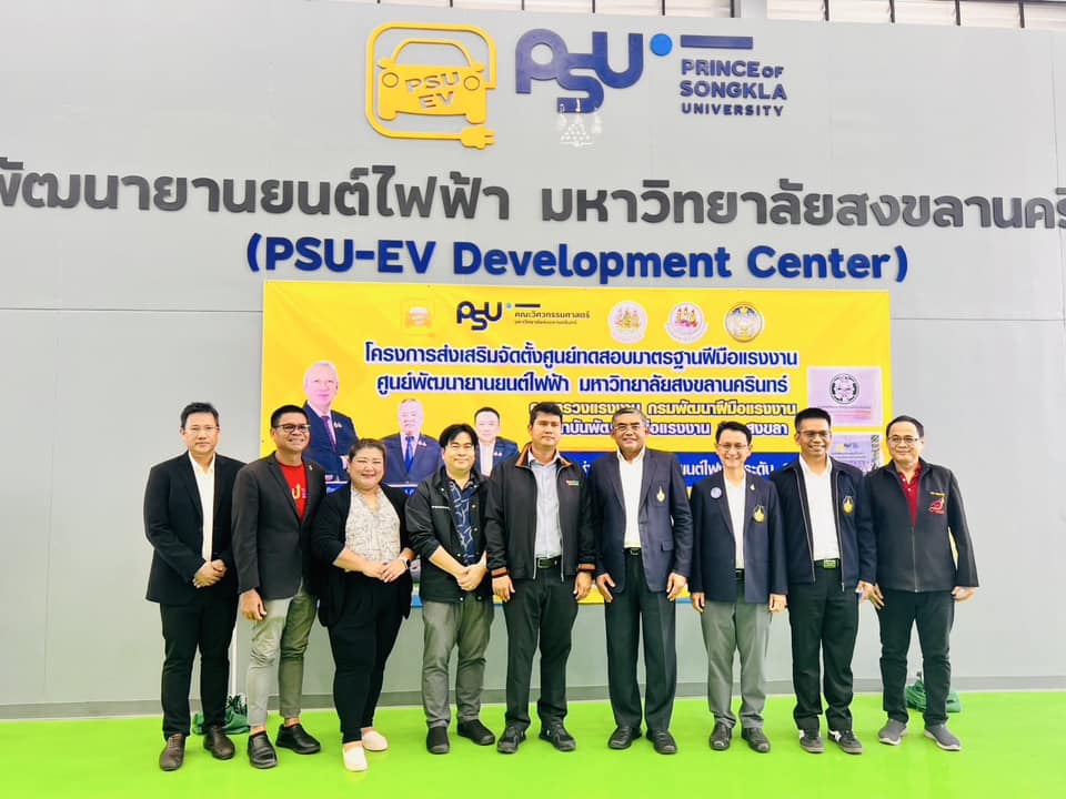 รองศาสตราจารย์ ดร.จตุพร แก้วอ่อน คณบดี คณะวิศวกรรมศาสตร์ มหาวิทยาลัยทักษิณ ร่วมกับเครือข่ายเข้าร่วมพิธีมอบป้ายศูนย์ทดสอบมาตฐานฝีมือแรงงาน สาขาช่างซ่อมบำรุงรถยนต์ไฟฟ้า ระดับ 2 และร่วมเป็นเกียรติในพิธี มอบวุฒิบัตรทดสอบมาตรฐานฝีมือแรงงาน  ซึ่งมหาวิทยาลัยสงขลานครินทร์ ได้จัดพิธีรับมอบใบอนุญาตเป็นผู้ดำเนินการทดสอบมาตรฐานฝีมือแรงงาน สาขาช่างรถยนต์ไฟฟ้า ระดับที่ 2  โดยได้รับเกียรติจากนายพิพัฒน์   รัชกิจประการ รัฐมนตรีว่าการกระทรวงแรงงาน เป็นประธานและเป็นผู้มอบใบอนุญาต โดยมีผู้ช่วยศาสตราจารย์ ดร.นิวัติ แก้วประดับ อธิการบดีมหาวิทยาลัยสงขลานครินทร์ กล่าวต้อนรับ ผู้ช่วยศาสตราจารย์ ดร. นิคม สุวรรณวร คณบดีคณะวิศวกรรมศาสตร์กล่าวถึงพันธกิจของศูนย์ PSU – EV ภายใต้การดำเนินของคณะวิศวกรรมศาสตร์ และนายเดชา พฤกษ์พัฒนรักษ์ อธิบดีกรมพัฒนาฝีมือแรงงาน เมื่อวันที่ 14 มีนาคม 2568 ที่ผ่านมา ณ ศูนย์พัฒนายานยนต์ไฟฟ้า มหาวิทยาลัยสงขลานครินทร์ (PSU-EV Development Center)