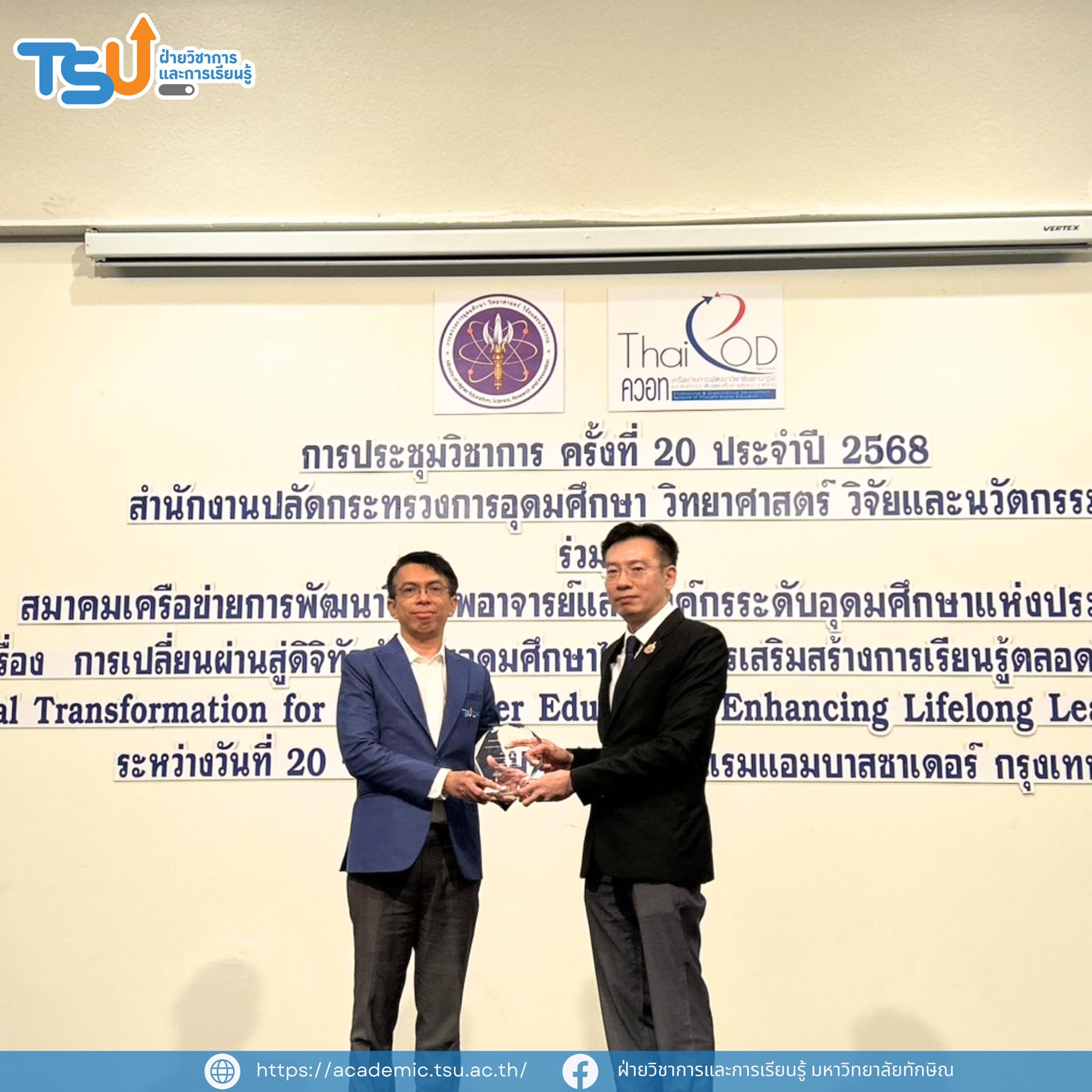 มหาวิทยาลัยทักษิณได้รับรางวัลเชิดชูเกียรติในฐานะสถาบันการศึกษาที่ส่งเสริมและพัฒนาการจัดการเรียนการสอนดีเด่นระดับประเทศ โดย รองศาสตราจารย์ ดร.สุทธิพร บุญมาก รองอธิการบดีฝ่ายวิชาการและการเรียนรู้ เป็นผู้แทนมหาวิทยาลัยเข้ารับรางวัลดังกล่าว นับเป็นความภาคภูมิใจของสถาบันที่ให้ความสำคัญกับคุณภาพการศึกษาและการพัฒนาอาจารย์ต้นแบบด้านการสอนอย่างต่อเนื่อง