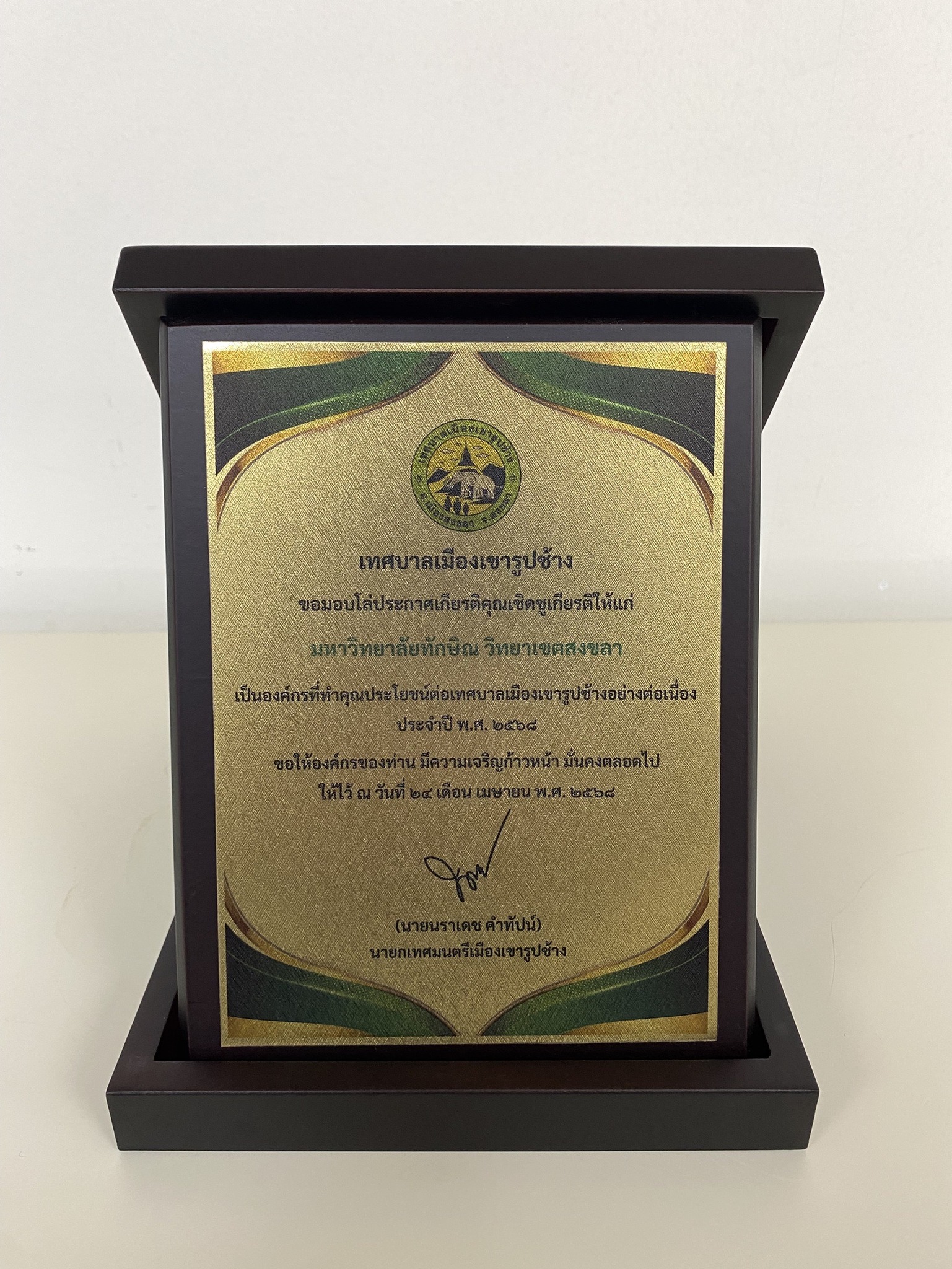 อาจารย์วีณา ลีลาประเสริฐศิลป์ รองอธิการบดี วิทยาเขตสงขลา มหาวิทยาลัยทักษิณ เป็นผู้แทนมหาวิทยาลัยทักษิณ รับมอบโล่เชิดชูเกียรติองค์กรที่ทำคุณประโยชน์ต่อเทศบาลเมืองเขารูปช้าง จากนายนราเดช คำทัปน์ นายกเทศมนตรีเมืองเขารูปช้าง ในการจัดกิจกรรม วันเทศบาล ประจำปี 2568 เมื่อวันที่ 24 เมษายน 2568 ณ ห้องประชุมชั้น 6 เทศบาลเมืองเขารูปช้าง ตำบลเขารูปช้าง อำเภอเมือง จังหวัดสงขลา