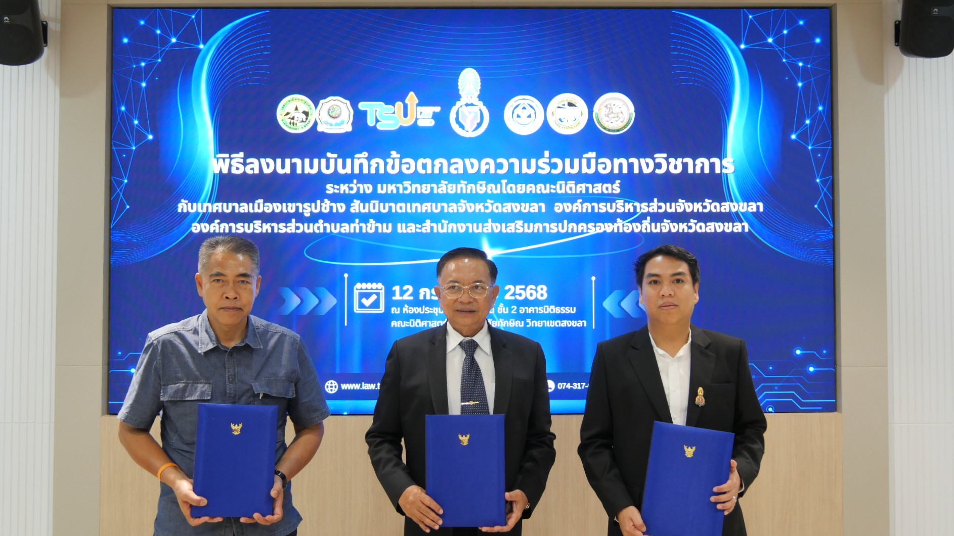 พิธีลงนามบันทึกข้อตกลงความร่วมมือทางวิชาการ ระหว่าง คณะนิติศาสตร์ มหาวิทยาลัยทักษิณ กับหน่วยงานองค์กรปกครองส่วนท้องถิ่นในจังหวัดสงขลา เพื่อขับเคลื่อนการศึกษาและสร้างประโยชน์ให้แก่สังคมอย่างยั่งยืน
