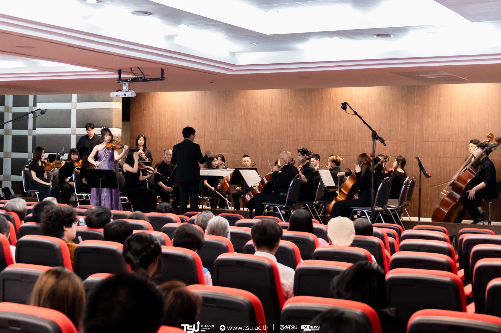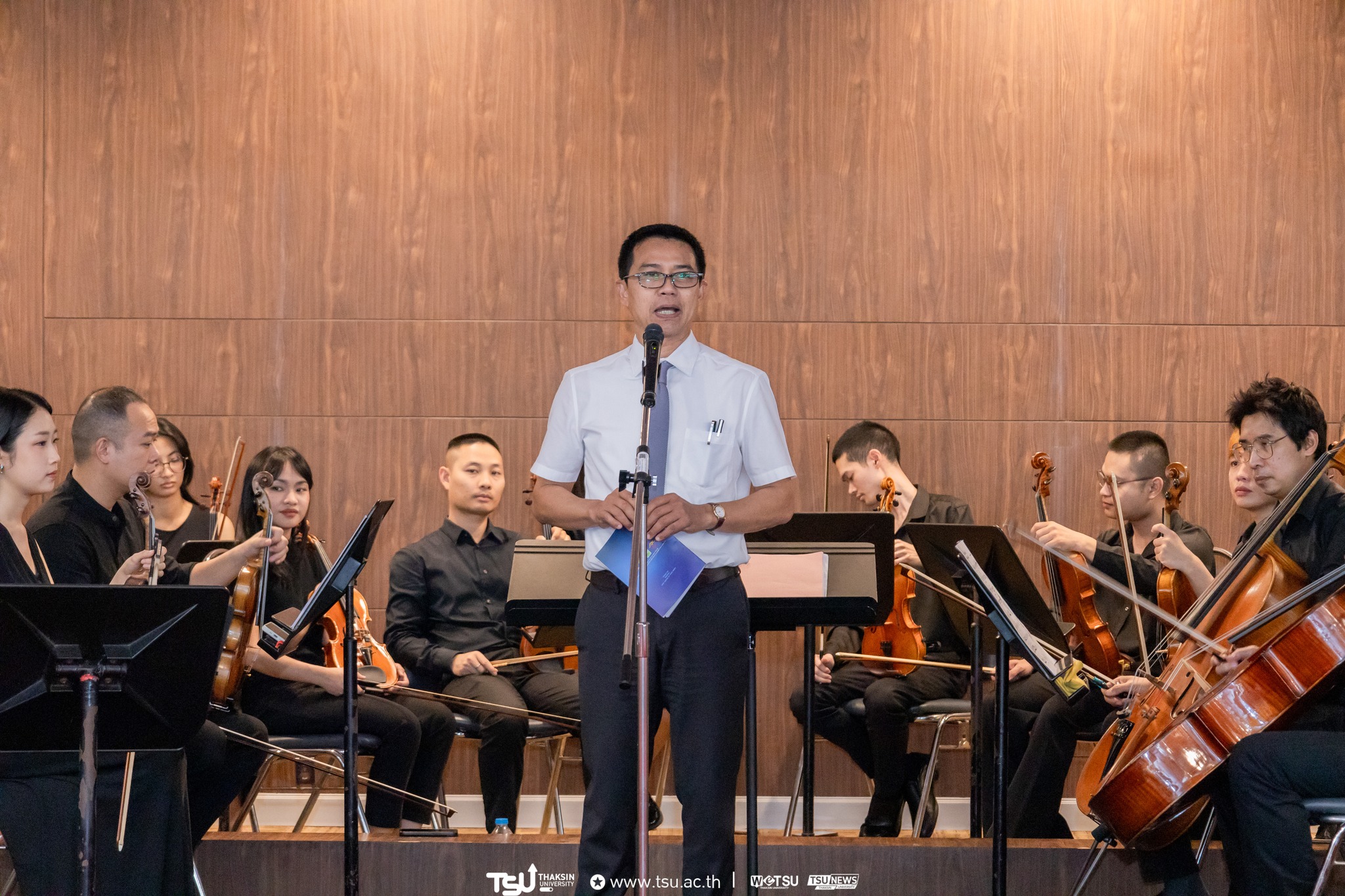 สำนักบริหารศิลปวัฒนธรรม จุฬาลงกรณ์มหาวิทยาลัย ร่วมกับ สำนักงานการวิจัยแห่งชาติ (วช.) สำนักงานศิลปวัฒนธรรมร่วมสมัย กระทรวงวัฒนธรรม และ มหาวิทยาลัยทักษิณ วิทยาเขตสงขลา จัดแสดงดนตรีภายใต้โครงการ “สำเนียงเสียงสยาม” ชุด “เสียงประสานปักษ์ใต้” บรรเลงโดย วงเครื่องสายจุฬาลงกรณ์มหาวิทยาลัย (Chulalongkorn University String Orchestra) โดยมีรองศาสตราจารย์ ดร.ณฐพงศ์ จิตรนิรัตน์ อธิการบดีมหาวิทยาลัยทักษิณ ให้เกียรติกล่าวต้อนรับ และร่วมรับชมการแสดง ความร่วมมือในครั้งนี้เพื่อส่งเสริมและอนุรักษ์มรดกทางวัฒนธรรมผ่านเสียงดนตรี รวมถึงเป็นเวทีแลกเปลี่ยนองค์ความรู้ทางศิลปะดนตรีระหว่างสถาบันการศึกษาและได้รับเกียรติจากผู้ช่วยศาสตราจารย์ ดร.ระวีวัฒน์ ไทยเจริญ คณบดีคณะศิลปกรรมศาสตร์ มอบช่อดอกไม้แก่ผู้แสดง  เมื่อวันอังคารที่ 29 กรกฎาคม 2568 เวลา 17.00 น. ณ ห้องประชุมแสงสุริยา ชั้น 1 อาคารศูนย์ปฏิบัติการวิชาชีพครู คณะศึกษาศาสตร์ มหาวิทยาลัยทักษิณ วิทยาเขตสงขลา