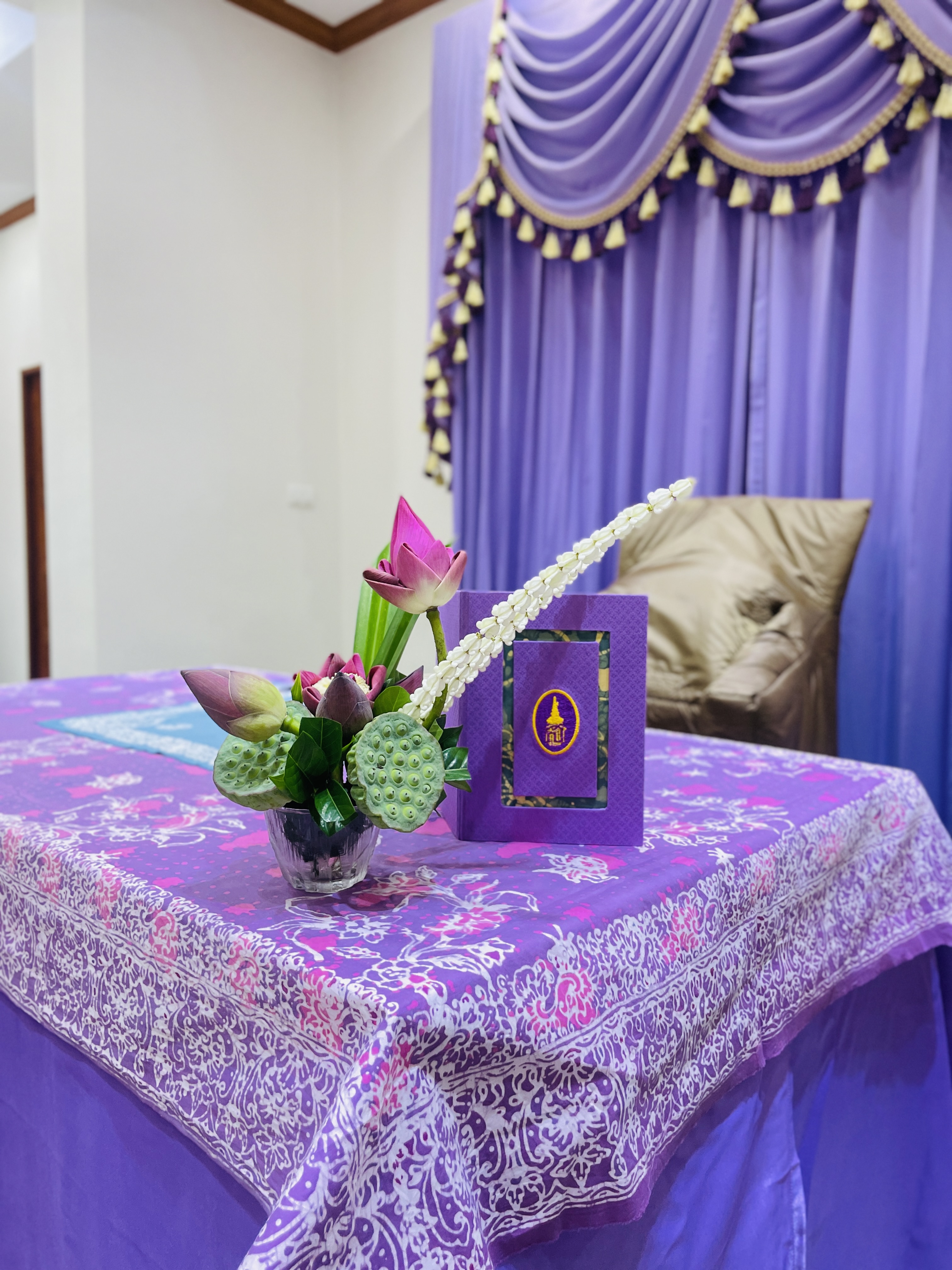 ในส่วนของรูปแบบการจัดโต๊ะเสวยในครั้งนี้ สะท้อนถึง “สีม่วงเทพรัตน์” อันทรงเป็นเอกลักษณ์ประจำพระองค์ ผ้าปูโต๊ะเลือกใช้ผ้าลายไทยร่วมสมัย ออกแบบด้วย “ลายดอกม่วงเทพรัตน์” โดยบ้านศิวะนาฎ ผ้าพิมพ์ลายเมืองชัยบุรี จังหวัดพัทลุง ถ่ายทอดความวิจิตรของภูมิปัญญาช่างผ้าไทยที่สืบทอดมาอย่างยาวนาน รายละเอียดอ่อนช้อยสะท้อนรากเหง้าวัฒนธรรม แต่ถูกตีความใหม่ให้ร่วมสมัยและเหมาะสมต่อการใช้ในพระราชพิธี ทำให้ผืนผ้าไม่เพียงเป็นเครื่องตกแต่ง หากแต่เป็น “งานศิลป์ที่มีชีวิต” การจัดสำรับอาหารลังกาสุกะร่วมสมัย และโต๊ะเสวยในครั้งนี้ มิใช่เพียงมื้ออาหาร แต่คือการถักทอศิลป์และวัฒนธรรม ถ่ายทอดรสชาติภูมิปัญญาปักษ์ใต้ สู่โต๊ะเสวยอันทรงคุณค่า อย่างงดงามและร่วมสมัยในระดับสากล