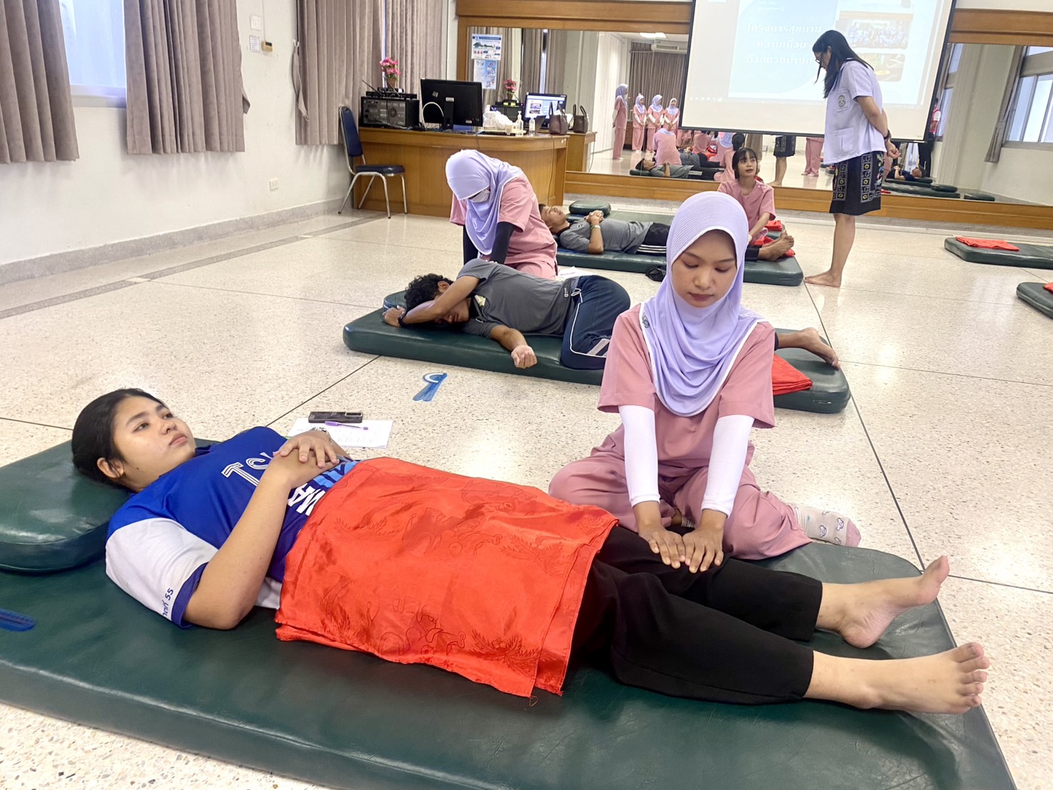 วันที่ 29 กันยายน 2568 หลักสูตรการแพทย์แผนไทยบัณฑิต คณะวิทยาการสุขภาพและการกีฬา มหาวิทยาลัยทักษิณ วิทยาเขตพัทลง นำทีมโดย ผศ.ดร.ยมล พิทักษ์ภาวศุทธิ อาจารย์ผู้รับผิดชอบรายวิชาหัตถเวชกรรมไทย 2 พร้อมทั้งคณาจารย์ในรายวิชา และนิสิตหลักสูตรการแพทย์แผนไทยบัณฑิต ชั้นปีที่ 2 จำนวน 38 คน ให้บริการนวดรักษา เพื่อส่งเสริมสุขภาพบุคลากร และประชาชนทั่วไป ที่มีอาการทางระบบกล้ามเนื้อ โดยไม่มีค่าใช้จ่าย ณ ห้อง วสก 1202 ชั้น 2 คณะวิทยาการสุขภาพเเละการกีฬา มหาวิทยาลัยทักษิณ วิทยาเขตพัทลุง