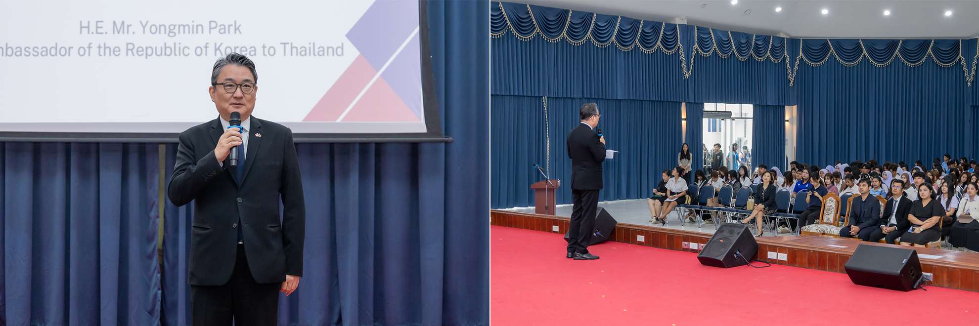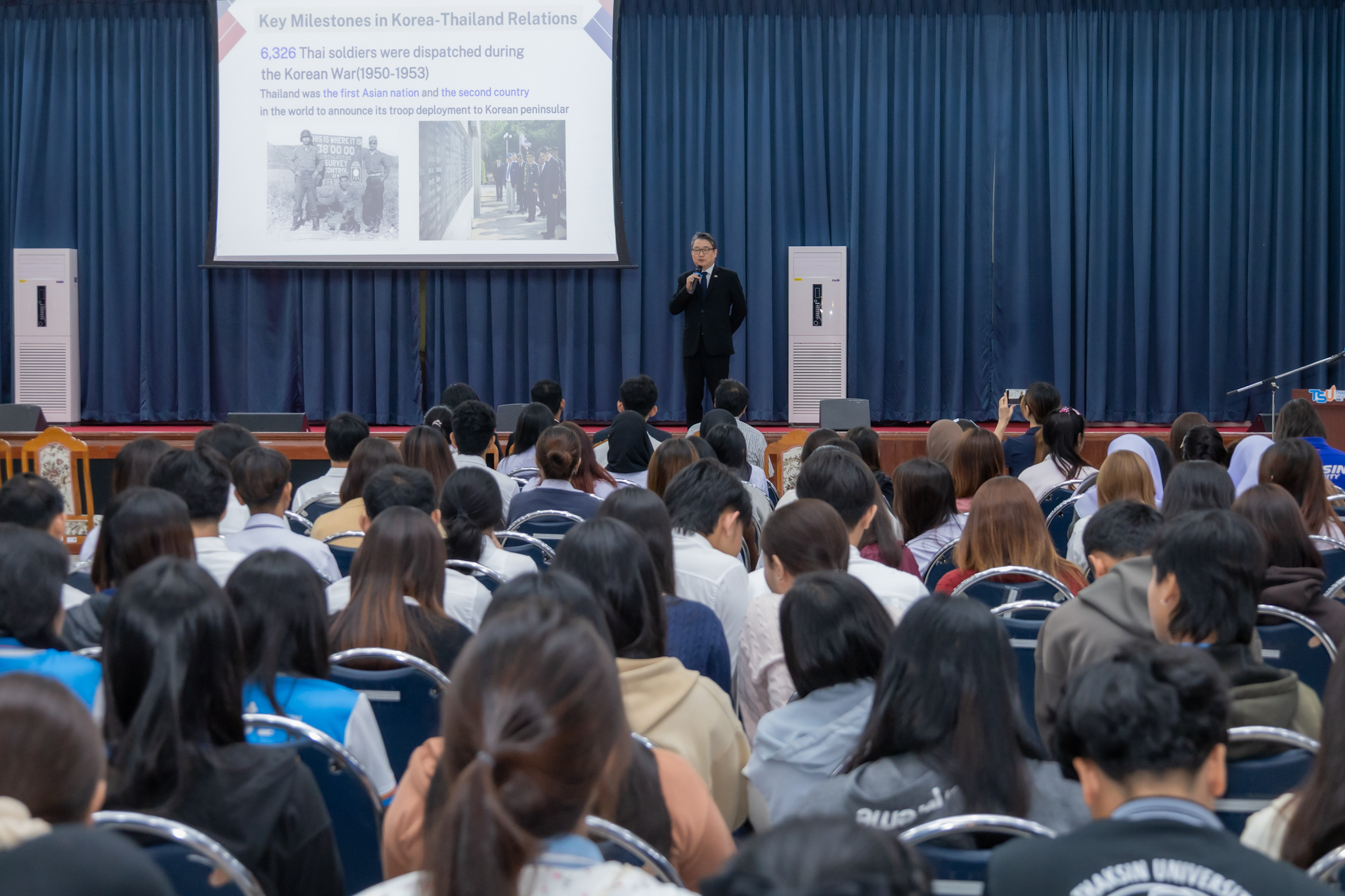 อีกหนึ่งกิจกรรมสำคัญของการเยือนครั้งนี้ คือการบรรยายพิเศษโดยเอกอัครราชทูต H.E. Yongmin Park ในหัวข้อ “Soft Power in Action: Korea’s Educational and Cultural Promotion in Thailand” ณ หอประชุมปาริชาต มหาวิทยาลัยทักษิณ วิทยาเขตสงขลา โดยเน้นย้ำบทบาทของเกาหลีใต้ในการใช้พลังทางวัฒนธรรม (Cultural Soft Power) และระบบการศึกษาเป็นเครื่องมือสร้างความสัมพันธ์อันแน่นแฟ้นกับนานาประเทศ รวมถึงการชี้ให้เห็นความเป็นไปได้ใหม่ ๆ ในการร่วมมือด้านภาษา วัฒนธรรม และโครงการแลกเปลี่ยนนิสิต ในอนาคต บรรยากาศในหอประชุมเป็นไปด้วยความอบอุ่นและสนุกสนานในการเรียนรู้ โดยมีนิสิตเข้าร่วมฟังบรรยายจำนวนกว่า 300 คน