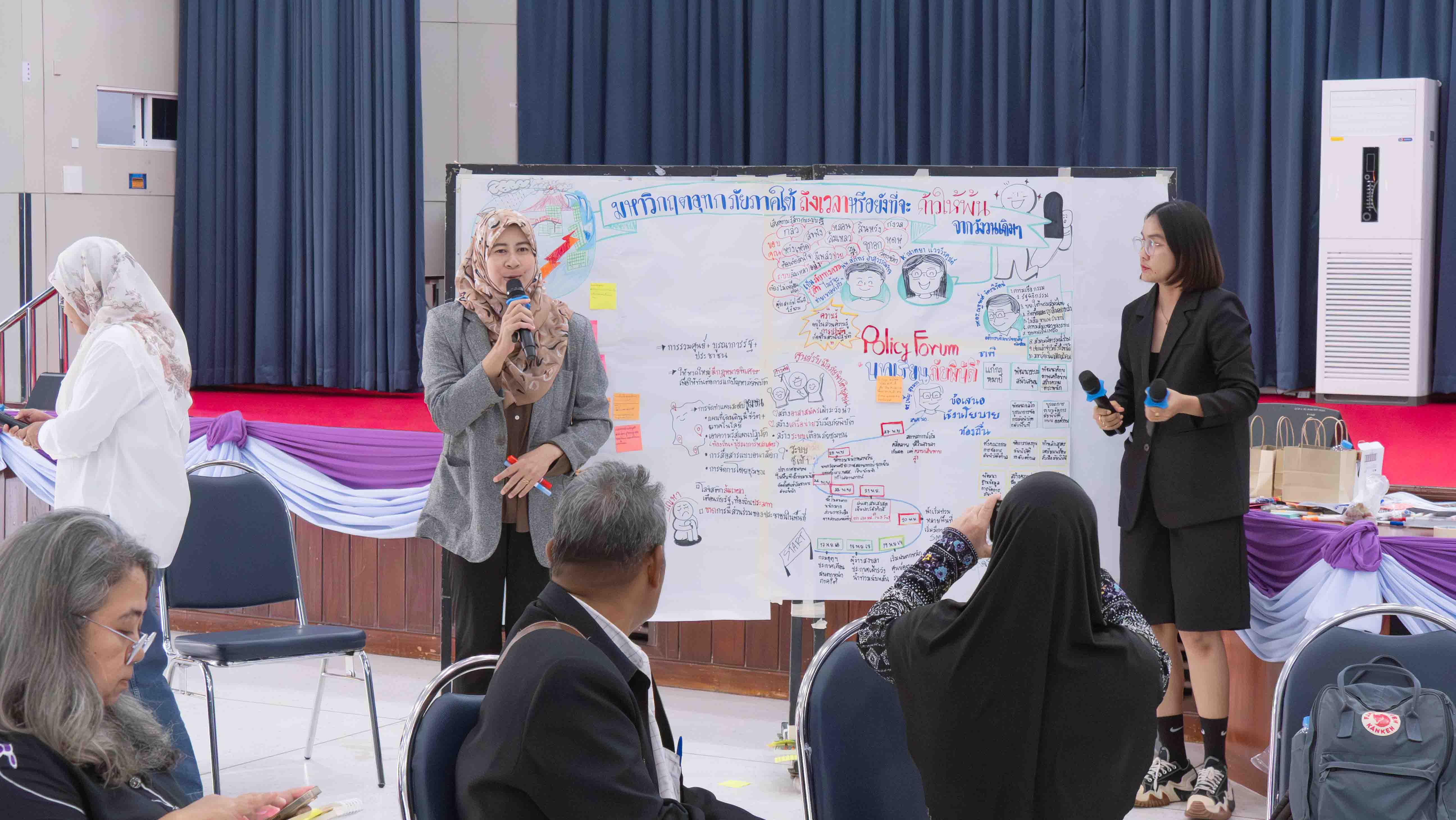 การเสวนาได้แบ่งเป็น 3 กลุ่มหลักตามช่วงเวลาของการจัดการภัยพิบัติ ได้แก่ กลุ่มก่อนเกิดเหตุ ที่เน้นการเตรียมการและป้องกัน กลุ่มระหว่างเกิดเหตุ ที่มุ่งเน้นการจัดการเหตุฉุกเฉินและการช่วยเหลือเบื้องต้น และกลุ่มหลังเกิดเหตุ ที่เน้นการฟื้นฟูและพัฒนาชุมชนให้กลับมามีคุณภาพชีวิตที่ดีขึ้น พร้อมสร้างความเข้มแข็งให้พร้อมรับมือกับวิกฤตในอนาคต