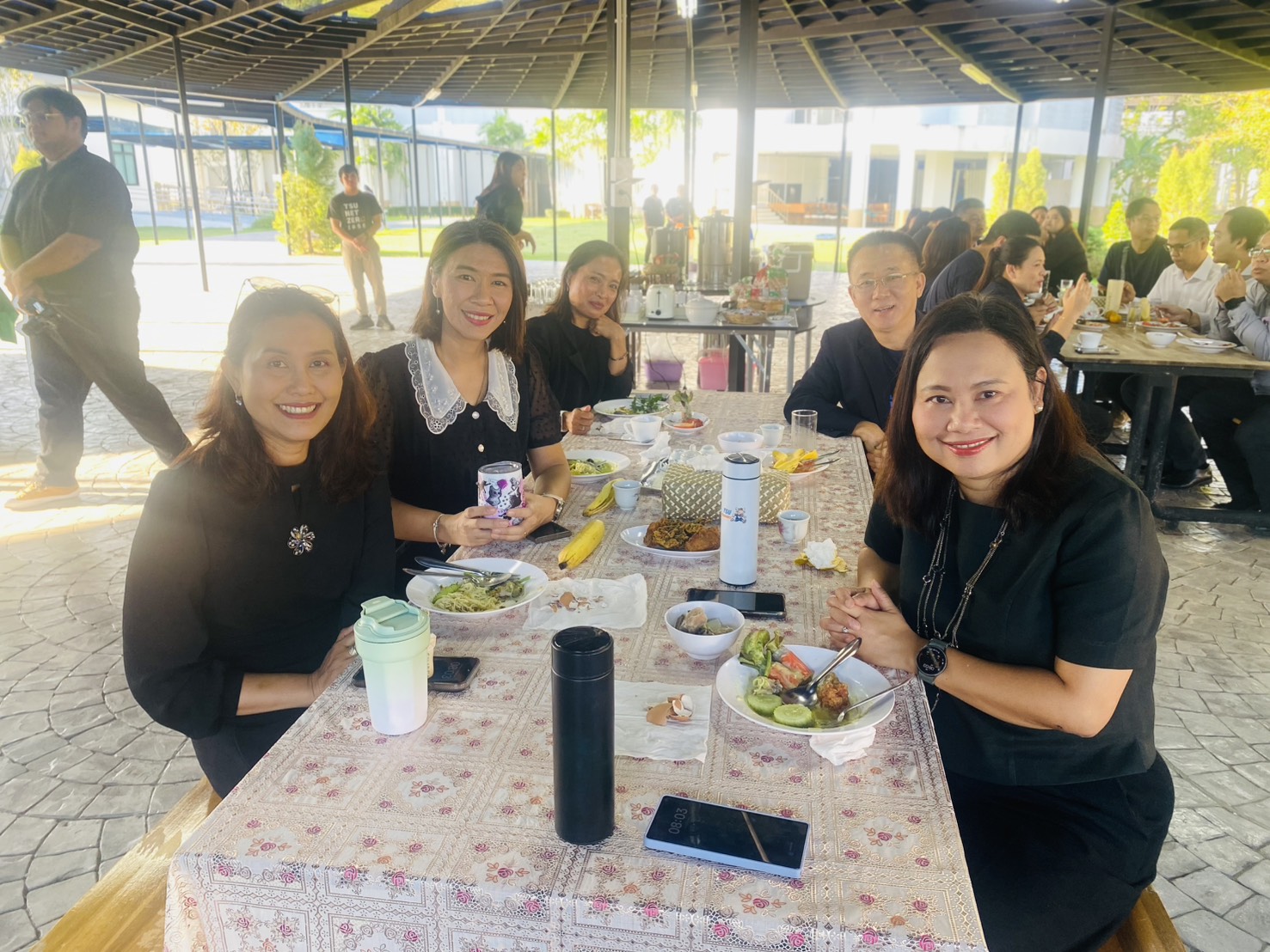 ผศ.ดร.สุนิสา คงประสิทธิ์ ผู้อำนวยการโรงเรียนสาธิตมหาวิทยาลัยทักษิณ ฝ่ายมัธยม ในฐานะเจ้าภาพกล่าวว่า ทางโรงเรียนสาธิตฯ ได้นำนิสิตไปช่วยเหลือและสนับสนุนการจัดทำถุงยังชีพ ลงพื้นที่แจกถุงยังชีพในพื้นที่ และได้ลงไปช่วยทำความสะอาดโรงเรียนที่ประสบภัยน้ำท่วมในจังหวัดพัทลุง ซึ่งเป็นพลังเล็กๆ ที่คณะครูและนักเรียนได้พร้อมใจกันทำเพื่อสังคม นอกจากนี้ผู้บริหารแต่ละส่วนงานได้เล่าสู่เรื่องราวทั้งที่เกิดขึ้นและกำลังจะเกิดขึ้นภายในมหาลัยทักษิณในวงน้ำชายามเช้า