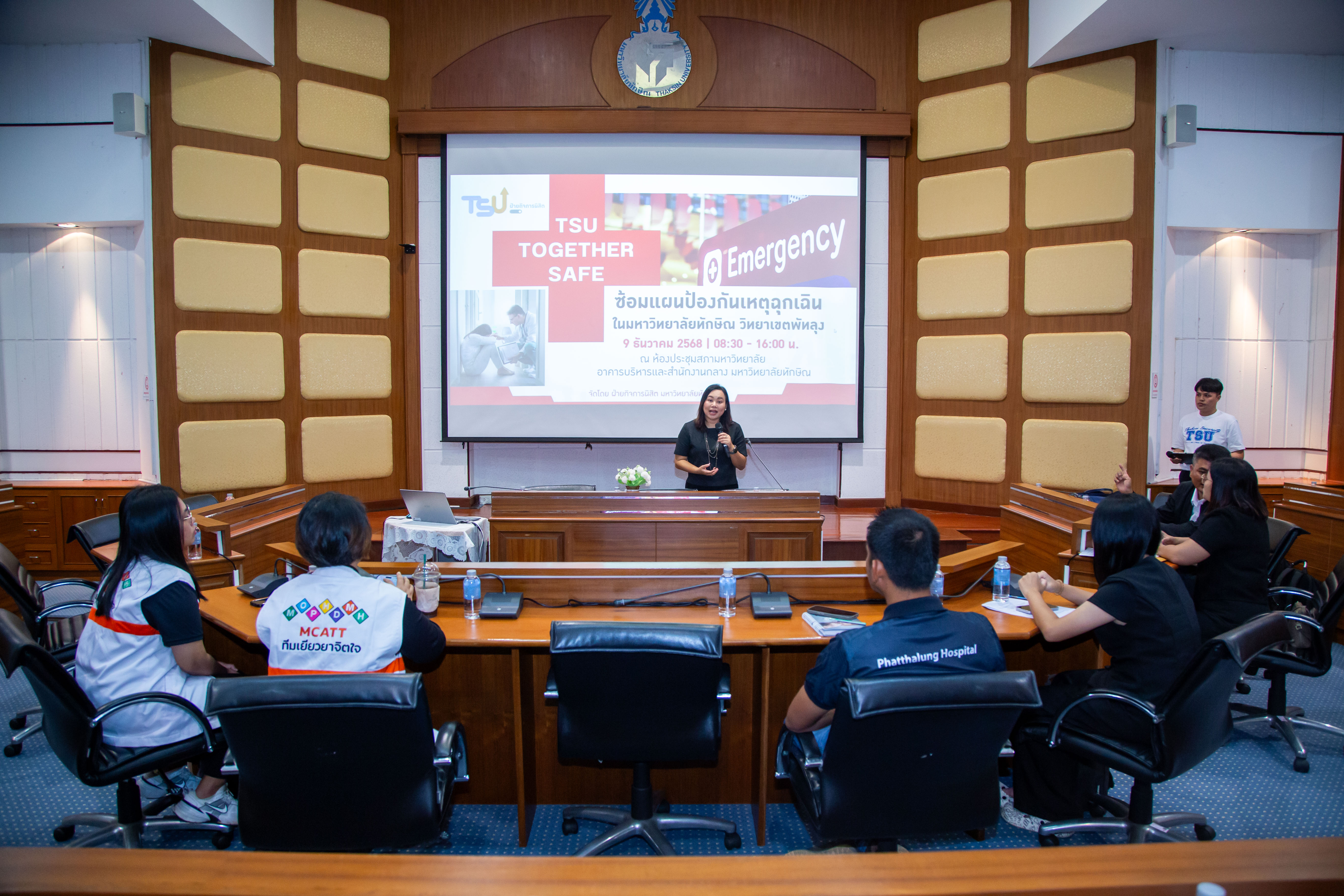 ฝ่ายกิจการนิสิต ร่วมกับสำนักงานวิทยาเขตพัทลุง จัดโครงการ TSU Together Safe : ซ้อมแผนป้องกันเหตุฉุกเฉิน เมื่อวันที่ 9 ธันวาคม 2568 ณ ห้องประชุมสภามหาวิทยาลัย อาคารบริหารและสำนักงานกลาง มหาวิทยาลัยทักษิณ วิทยาเขตพัทลุง เพื่อสร้างความรู้ ความเข้าใจและเตรียมพร้อมรับมือกับสถานการณ์ฉุกเฉินที่อาจเกิดขึ้นภายในมหาวิทยาลัย โดยได้รับเกียรติจาก ผู้ช่วยศาสตราจารย์ ดร.สิรยา สิทธิสาร รองอธิการบดีฝ่ายกิจการนิสิตและพันธกิจสัมพันธ์ เป็นประธานเปิดงาน