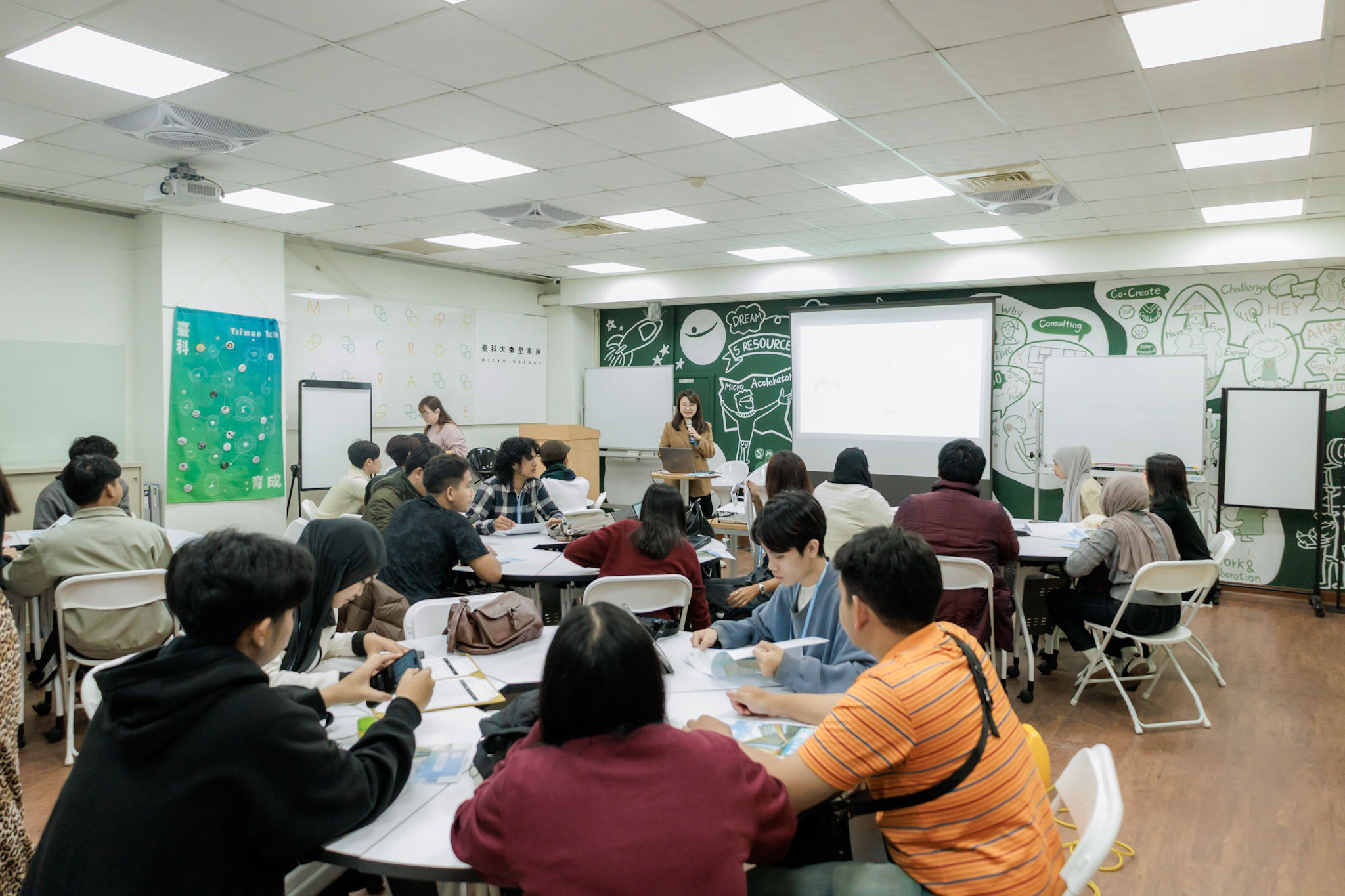 วันแรกของการเดินทางเริ่มต้นขึ้นท่ามกลางบรรยากาศอบอุ่นที่ Taiwan Tech เมื่อ Jessie Ou ผู้จัดการโครงการจาก Business Incubation Center (BIC) ได้ให้การต้อนรับคณะผู้บริหาร อาจารย์ เจ้าหน้าที่ และนิสิตจากมหาวิทยาลัยทักษิณ พร้อมแนะนำกำหนดการตลอดช่วงวันที่ 9–10 ธันวาคม 2568 ก่อนที่ Jerry Chen ที่ปรึกษาจาก BIC จะพานิสิตเข้าสู่กิจกรรม “Marshmallow Challenge” เพื่อเปิดใจและสร้างความคุ้นเคยระหว่างกัน จากนั้นต่อด้วยเวิร์กชอป Design Thinking แบบเข้มข้น ผ่านกรณีศึกษา ‘ห้องเรียน AI ปี 2035’ ที่ฝึกให้นิสิตตั้งคำถาม เข้าใจความต้องการของลูกค้า และทดลองสัมภาษณ์จริงเป็นการบ้าน