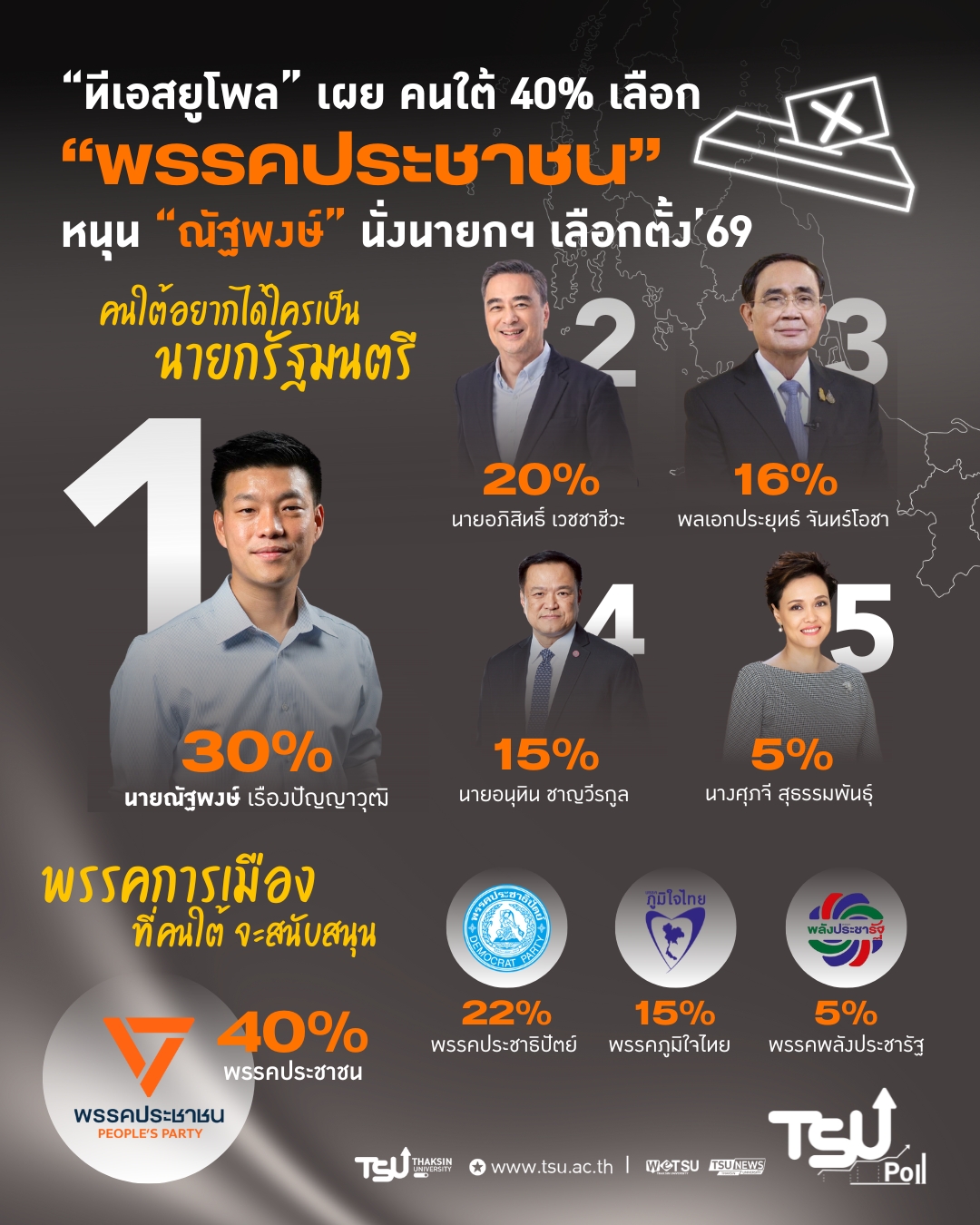 ทีเอสยูโพล (TSU Poll) มหาวิทยาลัยทักษิณ เผยผลสำรวจความคิดเห็นประชาชนในพื้นที่ 14 จังหวัดภาคใต้ จากกลุ่มตัวอย่างจำนวน 1,660 คน โดยสำรวจระหว่างวันที่ 14 ธันวาคม 2568 -17 มกราคม 2569 ในประเด็น “คนใต้อยากเลือกพรรคใดในการเลือกตั้งสมาชิกสภาผู้แทนราษฎร ปี 2569 พบว่า กลุ่มตัวอย่างส่วนใหญ่สนับสนุน พรรคประชาชนมากกว่า 40% ตามมาด้วย พรรคประชาธิปัตย์ 22% พรรคภูมิใจไทย 15% พรรคพลังประชารัฐ 5% และพรรคเพื่อไทย 5% ขณะที่ผลสำรวจคำถาม “คนใต้อยากได้ใครเป็นนายกรัฐมนตรี” พบว่า นายณัฐพงษ์ เรืองปัญญาวุฒิ ได้รับการสนับสนุนมากที่สุด คิดเป็น 30% รองลงมาคือ นายอภิสิทธิ์ เวชชาชีวะ คิดเป็น 20% พลเอกประยุทธ์ จันทร์โอชา คิดเป็น 16% นายอนุทิน ชาญวีรกูล คิดเป็น 15% และนางศุภจี สุธรรมพันธุ์ คิดเป็น 5%