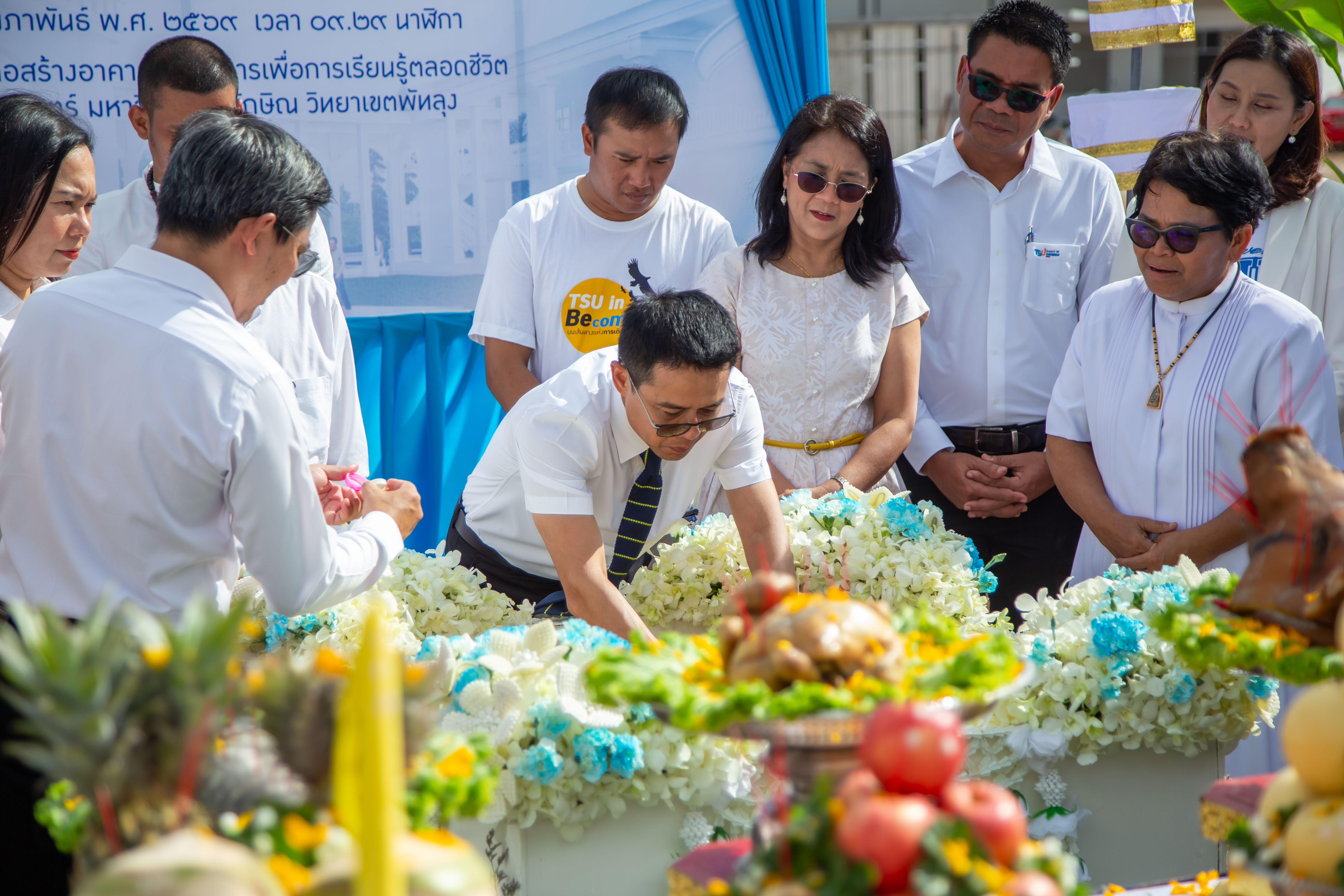 ท่ามกลางบรรยากาศที่เรียบง่าย แต่อบอวลด้วยความเป็นสิริมงคล โดยเริ่มต้นด้วยพิธีบวงสรวงและประกอบพิธีพราหมณ์ ก่อนเข้าสู่พิธีวางศิลาฤกษ์อาคาร ซึ่งถือเป็นสัญลักษณ์ของการเริ่มต้นโครงการก่อสร้าง และสะท้อนถึงความร่วมแรงร่วมใจในการขับเคลื่อนภารกิจด้านการศึกษาและการพัฒนาทรัพยากรมนุษย์ของมหาวิทยาลัยทักษิณ