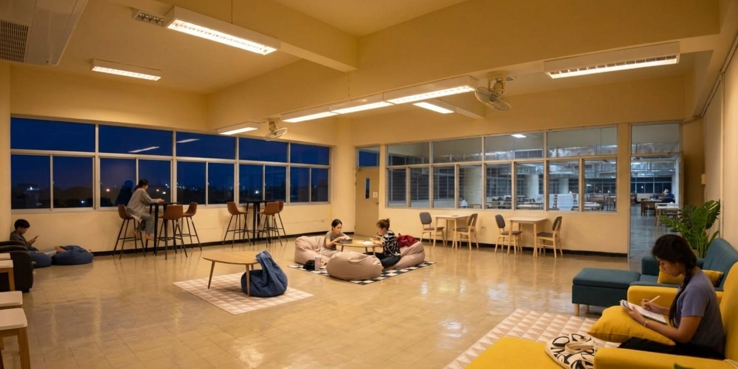 พื้นที่ที่เคยดูเป็นทางการในตอนกลางวัน พลันเปลี่ยนเป็นเวทีขนาดใหญ่ เราจะเห็นภาพของนิสิตกลุ่มใหญ่ที่ลานใต้หอพักปาริชาต และโรงอาหาร บรรยากาศตรงนี้คึกคักไปด้วยพลังงานของคนรุ่นใหม่ บางกลุ่มยังคงสวมชุดนิสิตที่ดูยับย่นไปบ้างตามชั่วโมงเรียนที่ยาวนาน พวกเขากำลังขะมักเขม้นกับการกางแผ่นชาร์ตและแล็ปท็อปเพื่อถกเถียงโปรเจกต์งานกลุ่มอย่างออกรส เสียงวิพากษ์วิจารณ์ไอเดียสลับกับเสียงคีย์บอร์ดที่รัวเร็วสะท้อนถึงความมุ่งมั่นที่ไม่ได้ลดน้อยลงไปตามแสงแดด