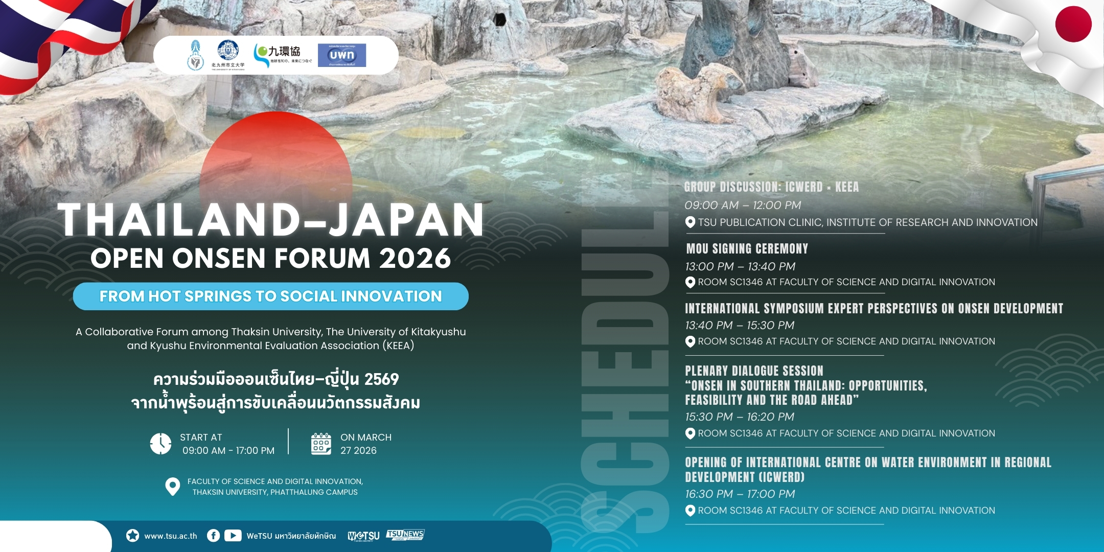 ความร่วมมือดังกล่าวจะถูกต่อยอดอย่างเป็นทางการผ่านพิธีลงนามบันทึกข้อตกลงความร่วมมือทางวิชาการ (MOU) ระหว่างมหาวิทยาลัยทักษิณ โดย รองศาสตราจารย์ ดร.ณฐพงศ์ จิตนิรัตน์ อธิการบดีมหาวิทยาลัยทักษิณ ร่วมกับ Kyushu Environmental Evaluation Association (KEEA) โดย Prof. Dr. Takayuki Shimaok, President of KEEA ในวันที่ 27 มีนาคม 2569 พร้อมจัดเวทีเสวนา “ออนเซ็นในภาคใต้ของไทย: โอกาส ความเป็นไปได้ และทิศทางในอนาคต” และการประชุมวิชาการนานาชาติด้านออนเซ็นครั้งแรกในภาคใต้