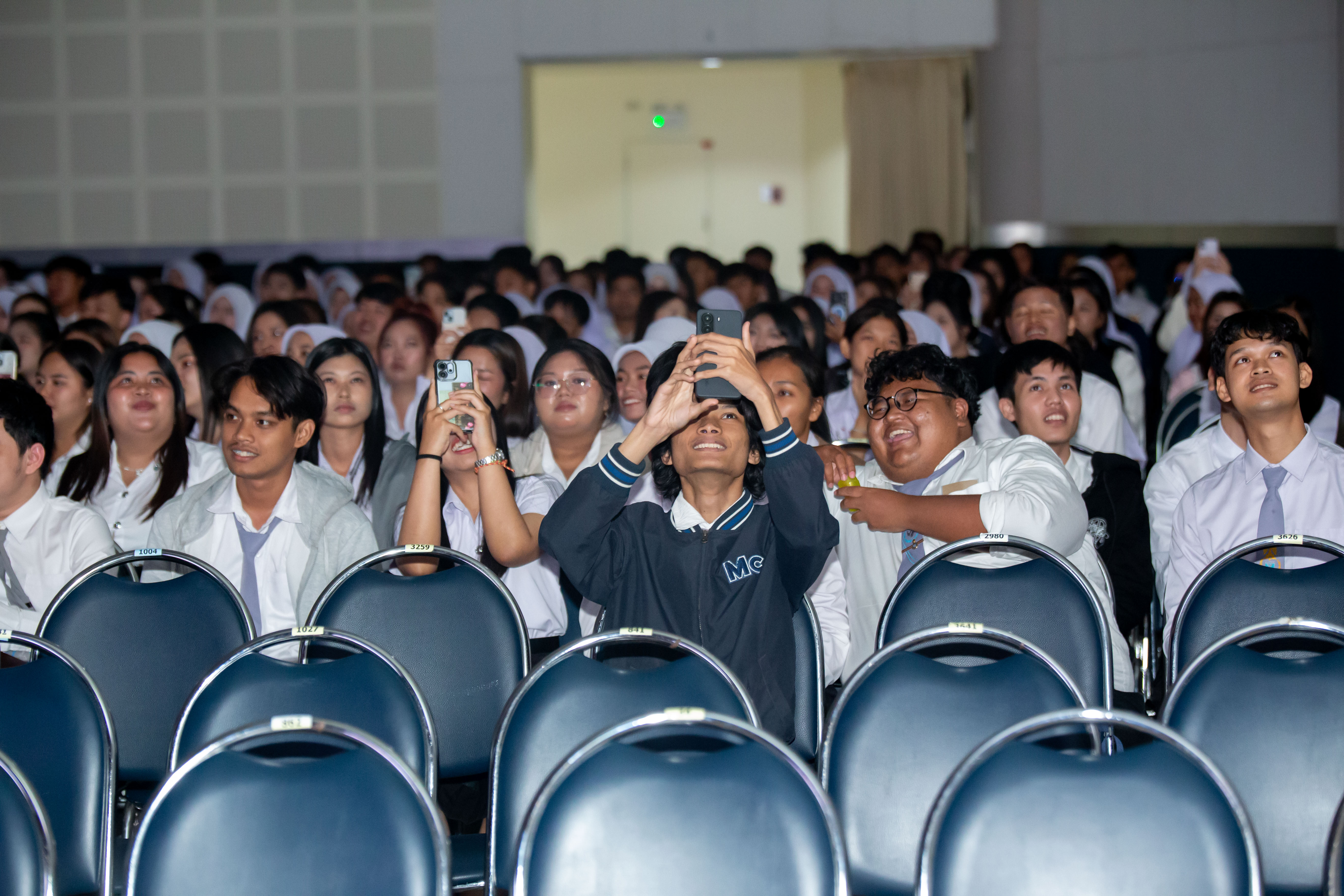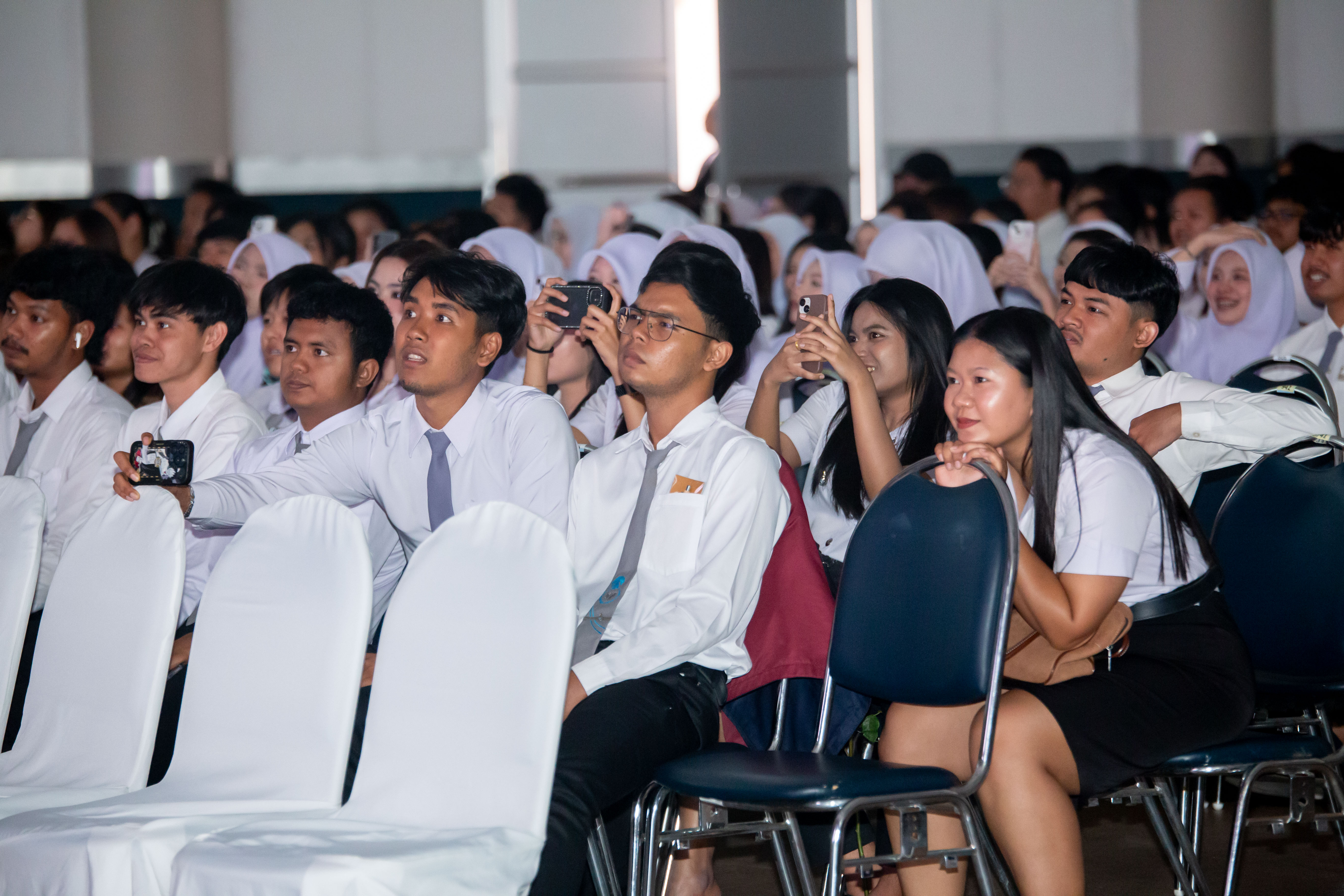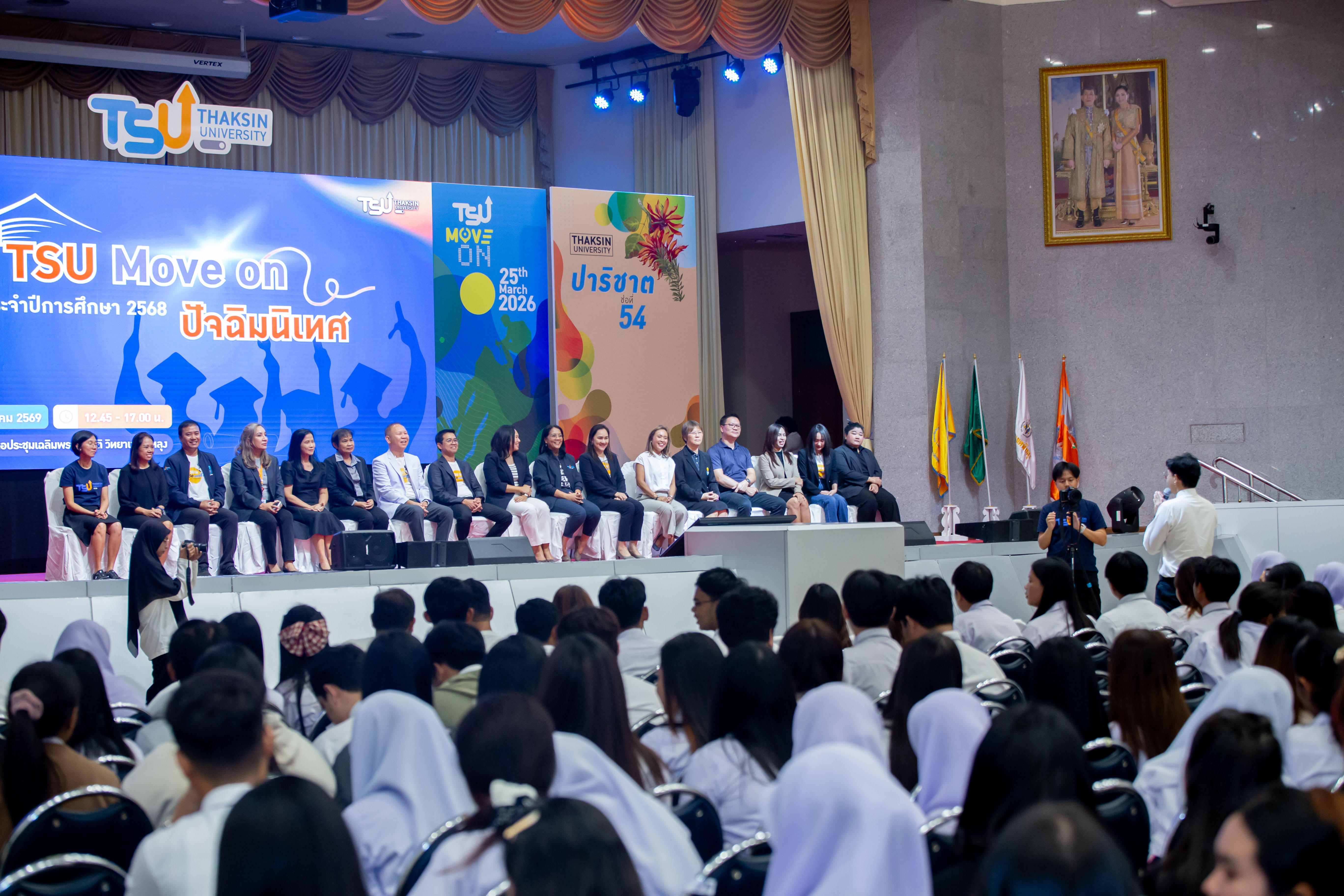 บรรยากาศเริ่มต้นด้วยกิจกรรม TSU Spirit ที่ค่อย ๆ เติมพลังให้หอประชุมกลับมาคึกคักอีกครั้ง ทั้งเสียงหัวเราะ เสียงเรียกชื่อเพื่อน และภาพความคุ้นเคยที่หลายคนอาจไม่ได้พบกันบ่อยเหมือนเดิมหลังจากวันนี้