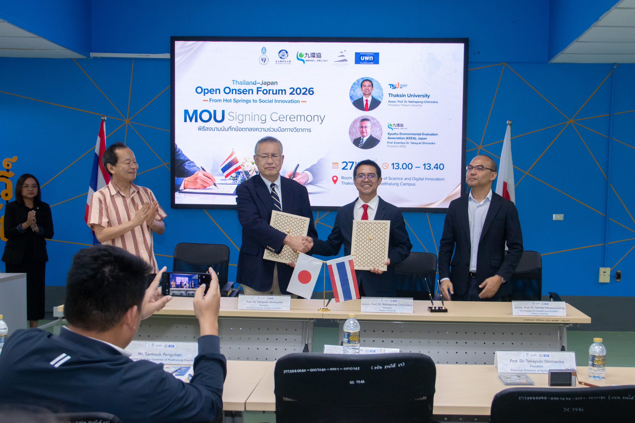 มหาวิทยาลัยทักษิณ ร่วมมือทางวิชาการ กับ สมาคมประเมินสิ่งแวดล้อม Kyushu Environmental Evaluation Association (KEEA) และ The University of Kitakyushu ประเทศญี่ปุ่น จัดตั้งศูนย์นานาชาติด้านสิ่งแวดล้อมทางน้ำเพื่อการพัฒนาภูมิภาค ภายใต้เวที “Thailand–Japan Open Onsen Forum 2026 “From Hot Springs to Social Innovation” หวังยกระดับองค์ความรู้ทรัพยากรน้ำพุร้อนในพื้นที่เพื่อพัฒนาสู่มาตรฐานออนเซ็นระดับโลก ต่อยอดพัฒนาเศรษฐกิจฐานรากส่งเสริมการท่องเที่ยวเชิงสุขภาพอย่างยั่งยืน