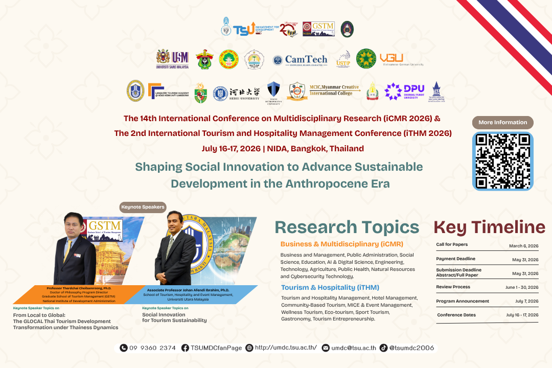 วิทยาลัยการจัดการเพื่อการพัฒนา ภายใต้ มหาวิทยาลัยทักษิณ (TSU) ร่วมกับ คณะการจัดการท่องเที่ยว สถาบันบัณฑิตพัฒนบริหารศาสตร์ (GSTM NIDA) และเครือข่ายสถาบันการศึกษานานาชาติ ขอเชิญนักวิชาการ นักวิจัย นิสิตนักศึกษา และผู้สนใจ เข้าร่วมการประชุมวิชาการระดับนานาชาติ The 14th International Conference on Multidisciplinary Research (iCMR 2026) และ The 2nd International Tourism and Hospitality Management Conference (iTHM 2026) ซึ่งมีกำหนดจัดขึ้นระหว่างวันที่ 16–17 กรกฎาคม 2569 ณ คณะการจัดการท่องเที่ยว สถาบันบัณฑิตพัฒนบริหารศาสตร์ กรุงเทพมหานคร