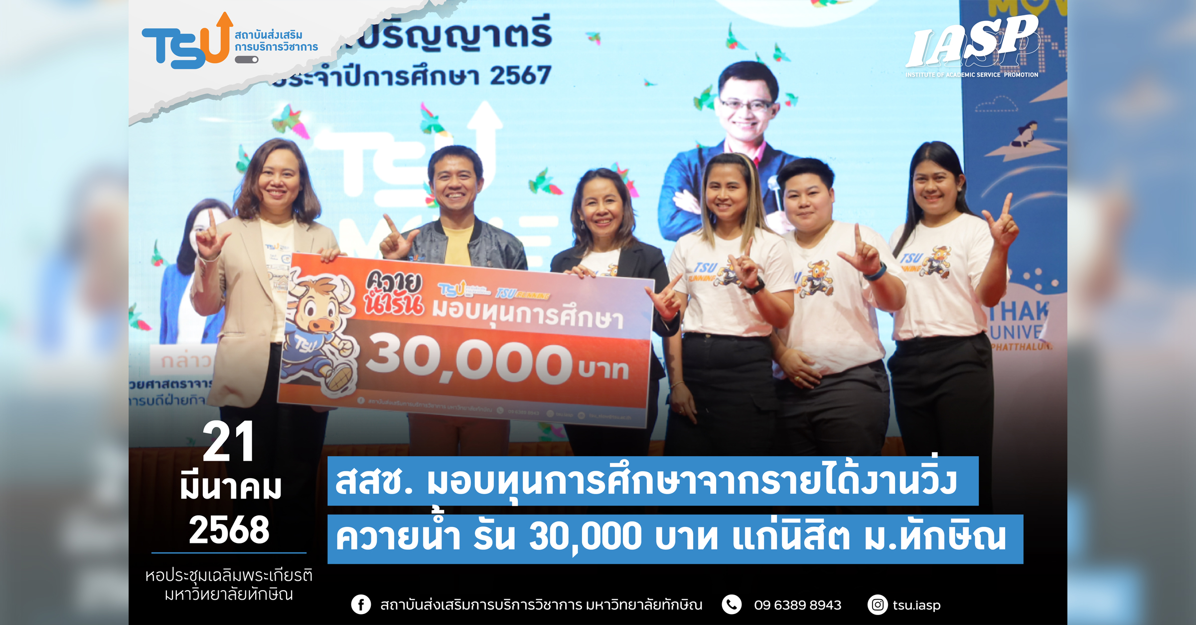 สสช. มอบทุนการศึกษาจากรายได้งานวิ่งควายน้ำ รัน 30,000 บาท แก่นิสิต ม.ทักษิณ...