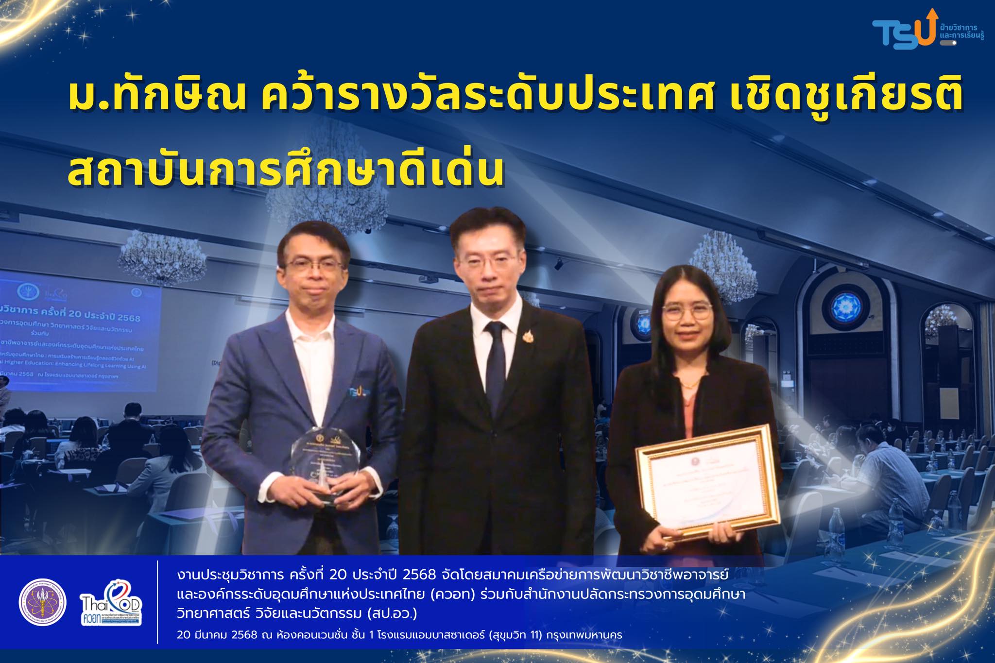 มหาวิทยาลัยทักษิณคว้ารางวัลระดับประเทศ เชิดชูเกียรติสถาบันการศึกษาดีเด่น...